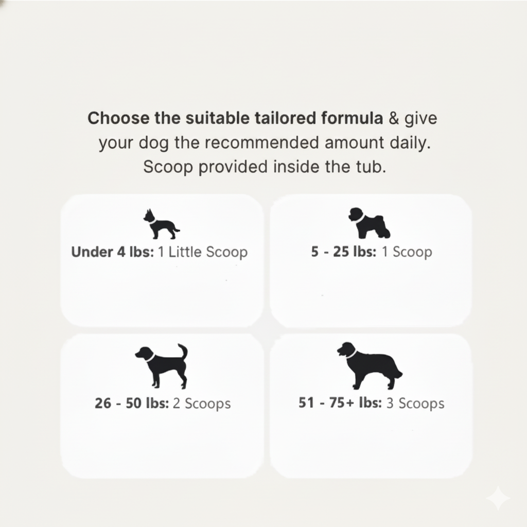 Each jar contains 100 servings. Most small and medium dogs get 1 scoop per day, while larger dogs may need 2–3 scoops. For many dogs, a jar lasts one to three months depending on size.