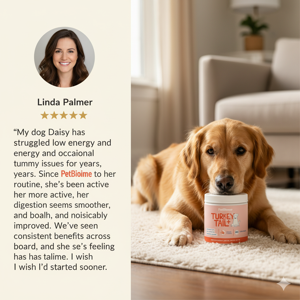 Daily gut support with Turkey Tail and probiotics helps balance the microbiome, strengthen immune response, and reduce inflammation at the source. It's not just about preventing problems—it's about giving your dog the foundation for vibrant, long-term wellness.