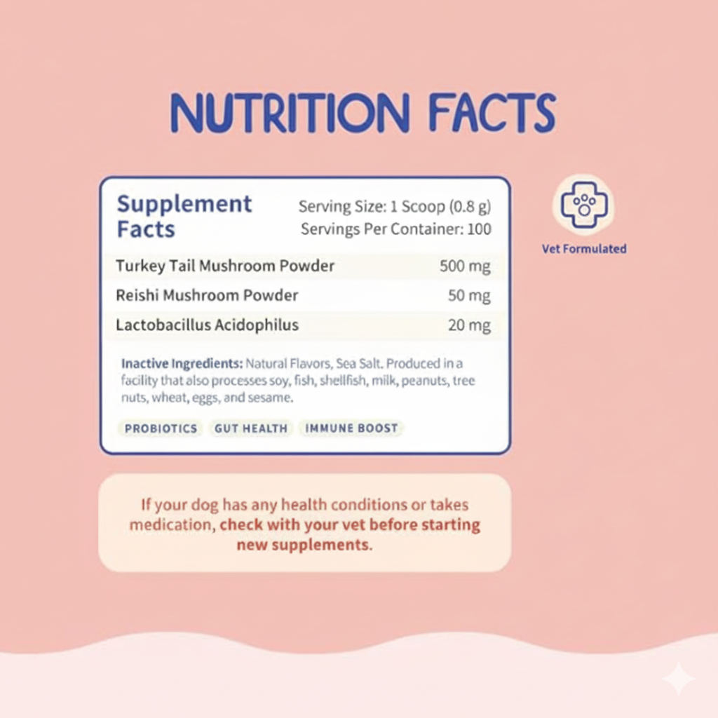Yes — TurkeyTail+ is made with organic mushroom powder, probiotics, and natural ingredients designed for everyday wellness. If your dog has a health condition or takes medication, check with your vet before starting any new supplement.