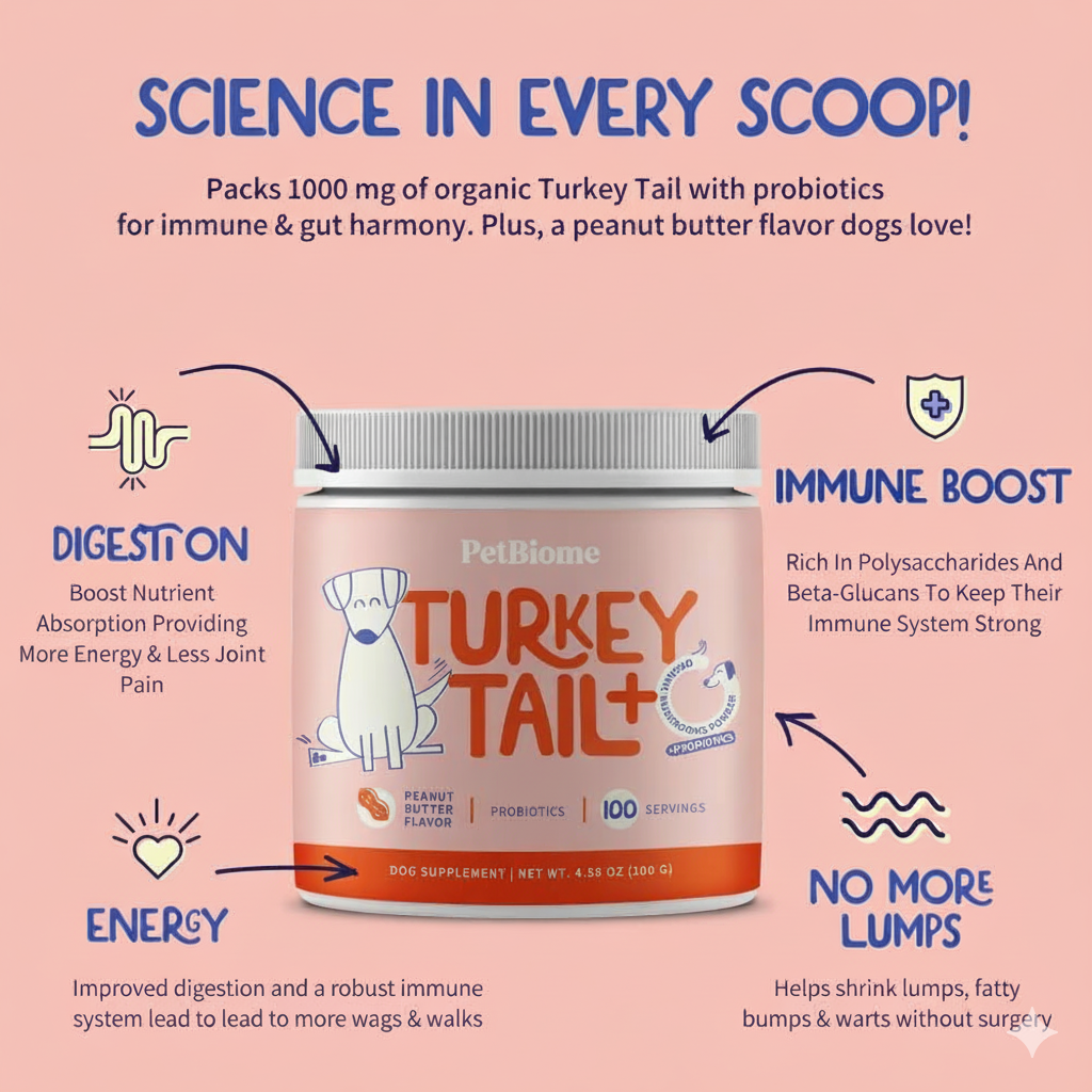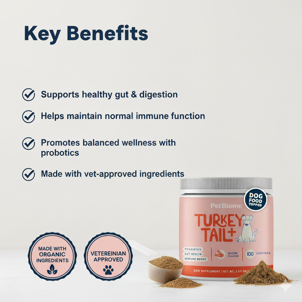 TurkeyTail+ is a daily wellness supplement made with organic turkey tail mushroom powder, probiotics, and natural ingredients designed to support your dog’s overall health. It was created for pet parents who want to help their dogs feel more comfortable, maintain healthy digestion, support natural immune function, and promote long-term vitality. Every scoop is easy to mix into food and made to fit seamlessly into your dog’s daily routine.